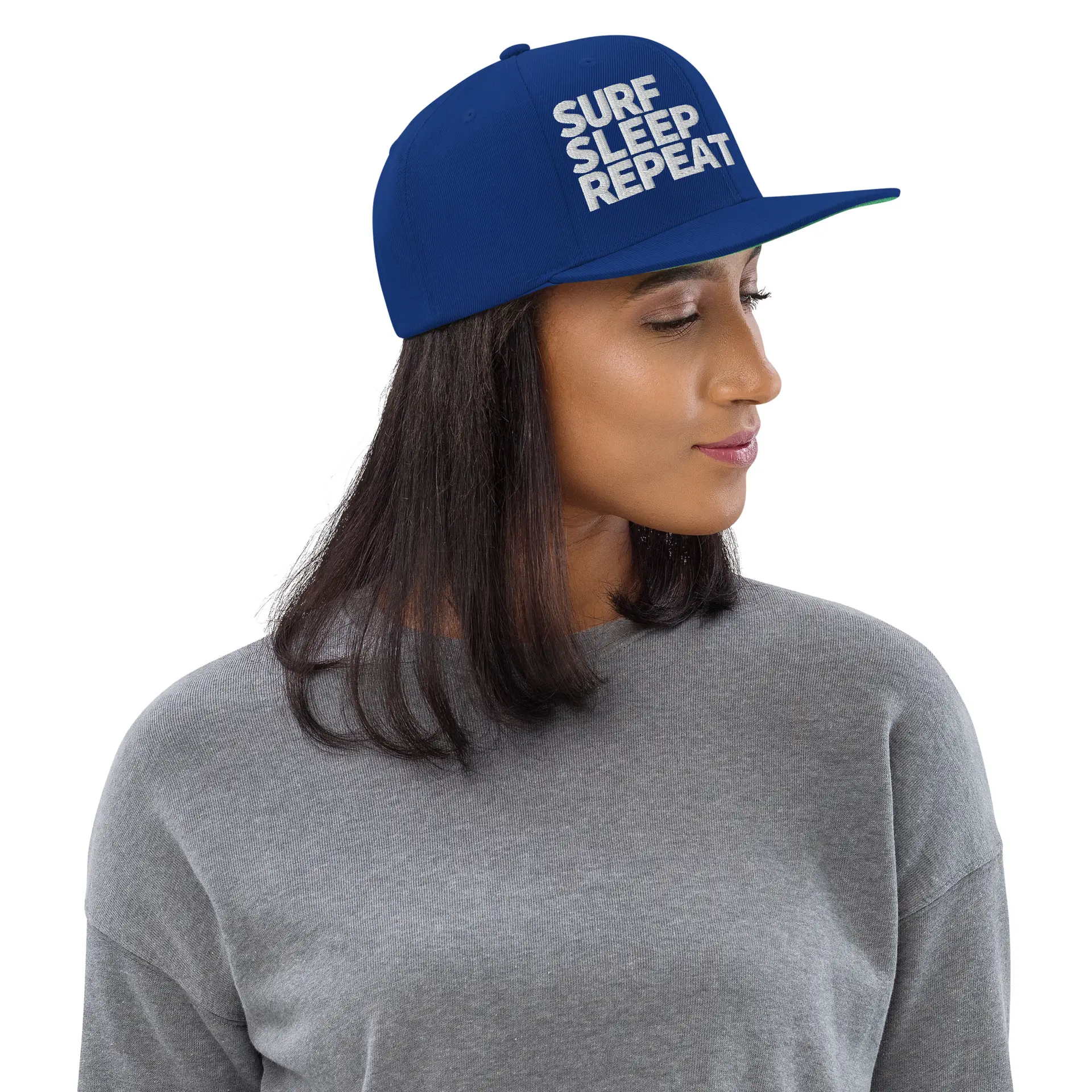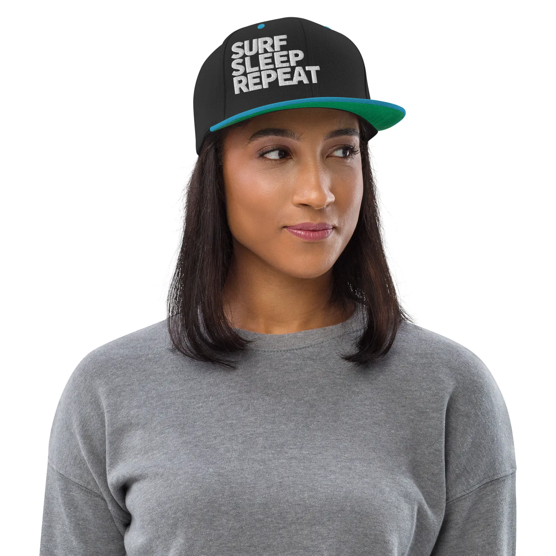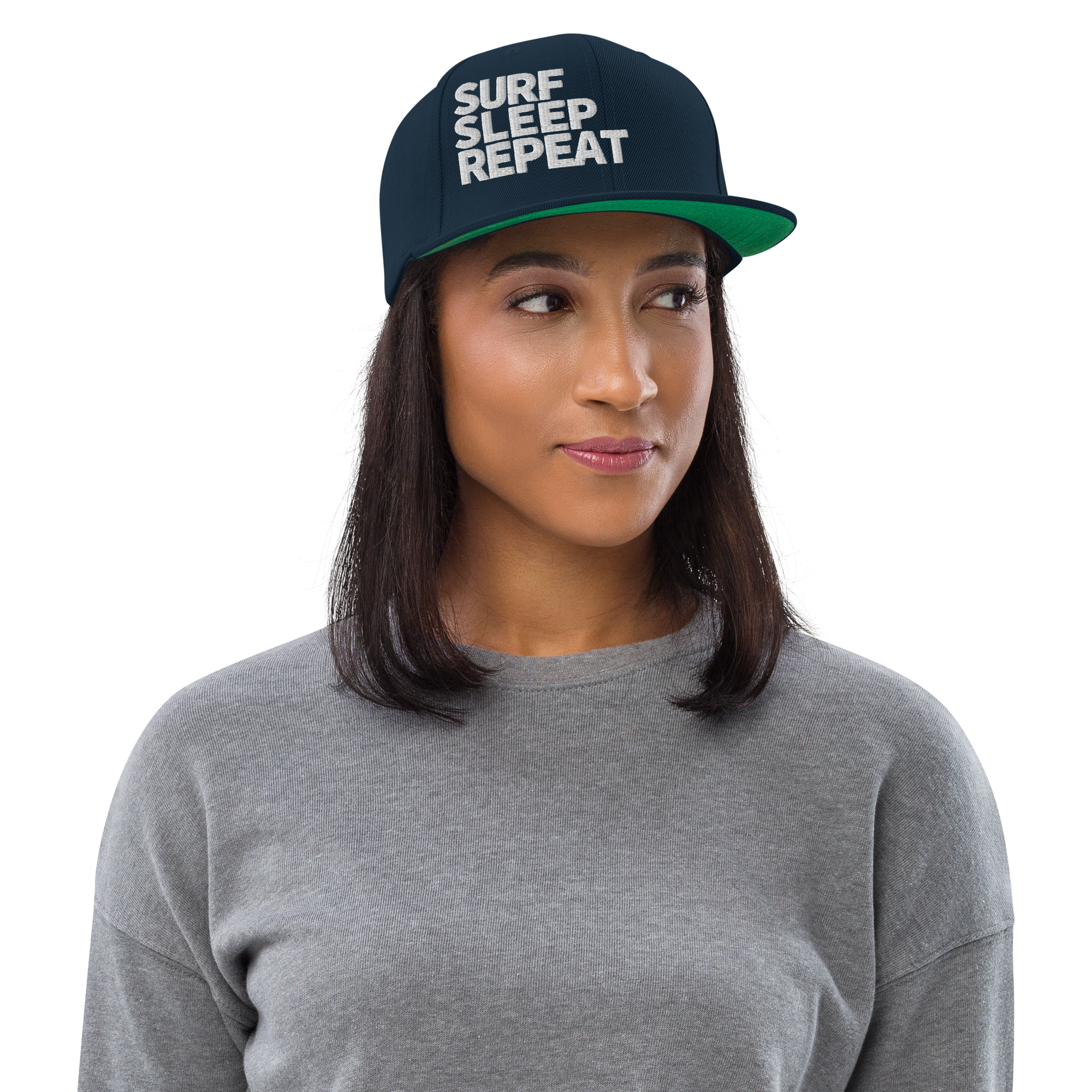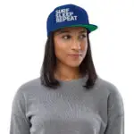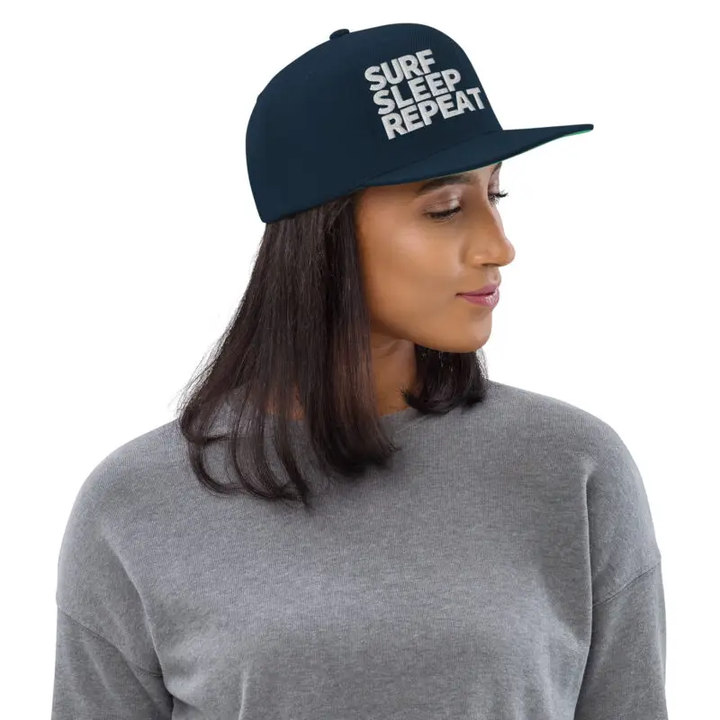Vorne SURF SLEEP REPEAT als hochwertiger Stick, links das dezente Surfboard-Logo. Die Le Gurp Snapback liefert klaren Surf-Look – vom Spotcheck bis in die City.